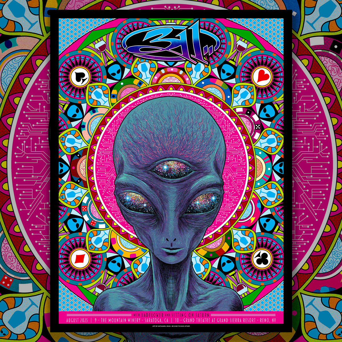18x24, official poster commemorating the August 9 and 10, 2025 performances by 311 in Saratoga, CA and Reno, NV. Each print is signed and numbered by the artist (not the band).