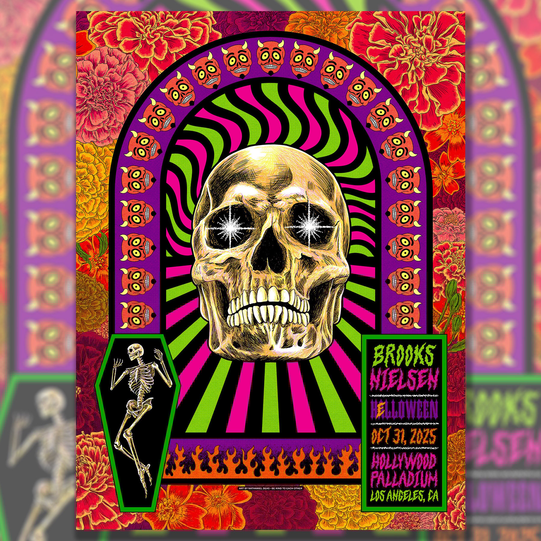 18x24, official poster commemorating the October 31, 2025 "Helloween" show by Brooks Nielsen of The Growlers in Los Angeles, CA. Each print is signed and numbered by the artist (not the band).