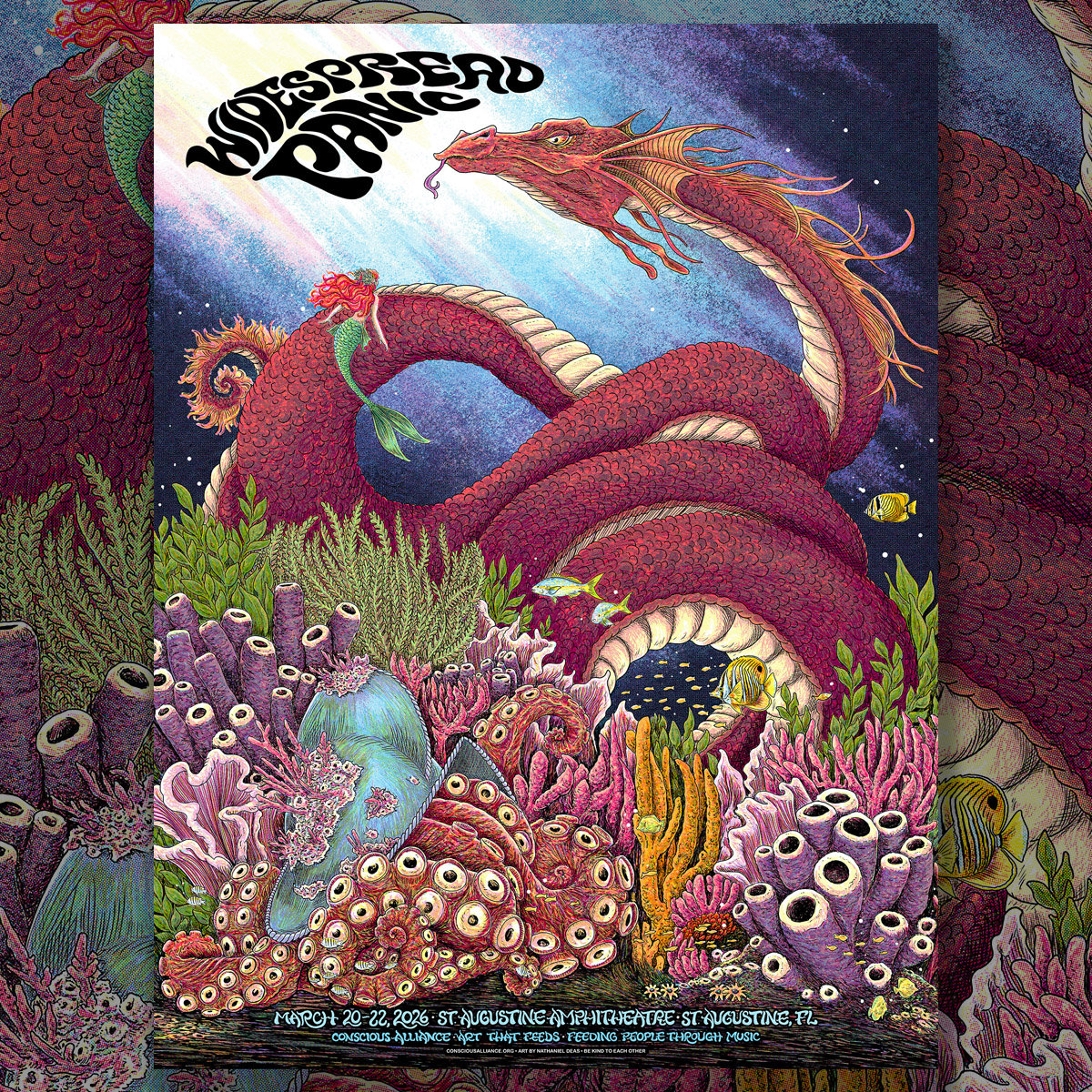 18x24, official poster commemorating the March 20-22, 2026 performances by Widespread Panic in St. Augustine, FL. Each print is signed and numbered by the artist (not the band). Four color screen print.